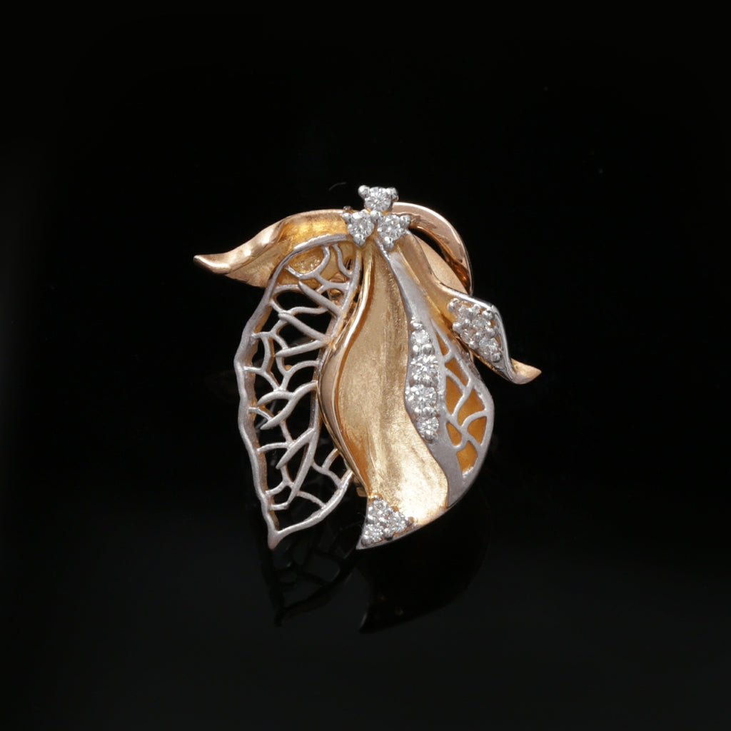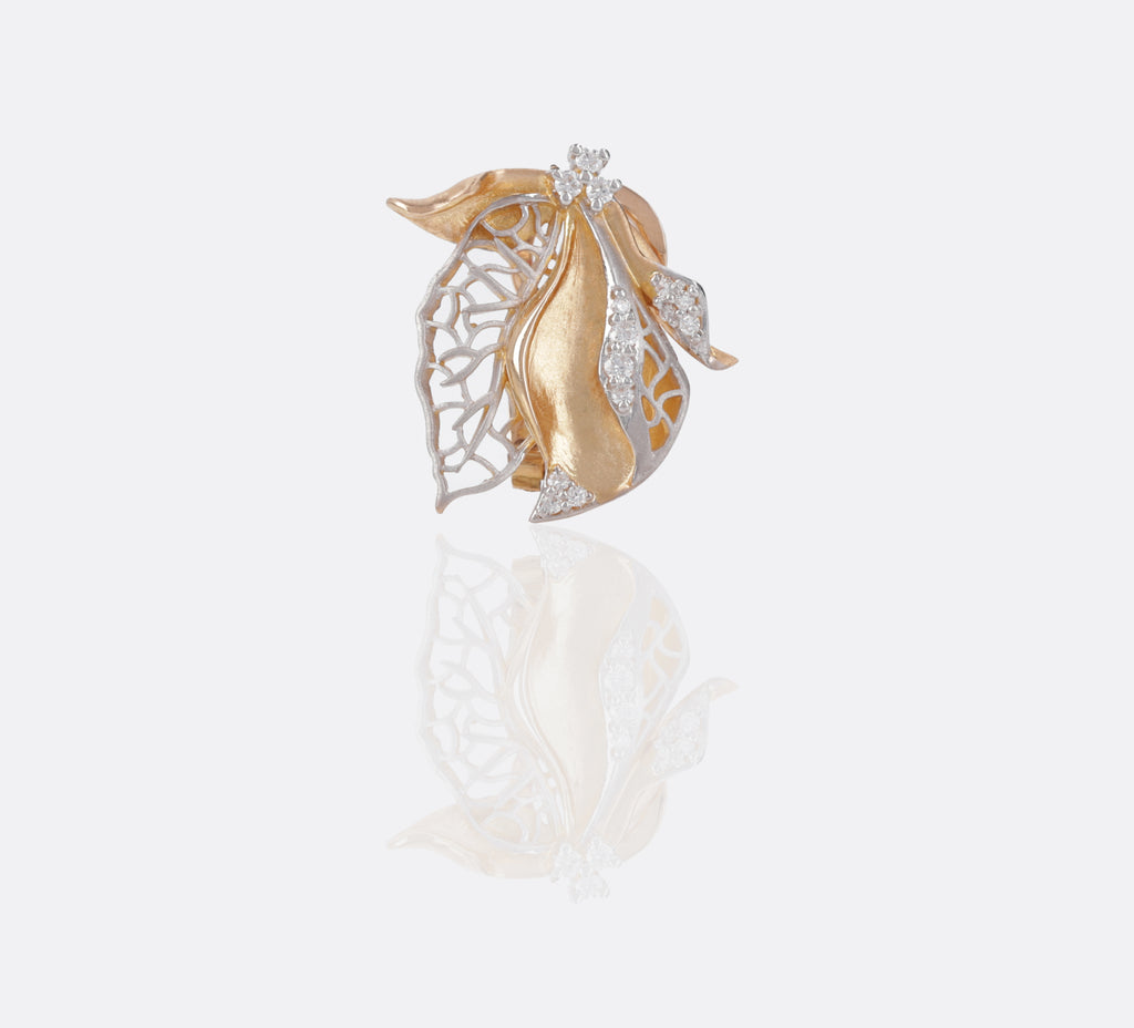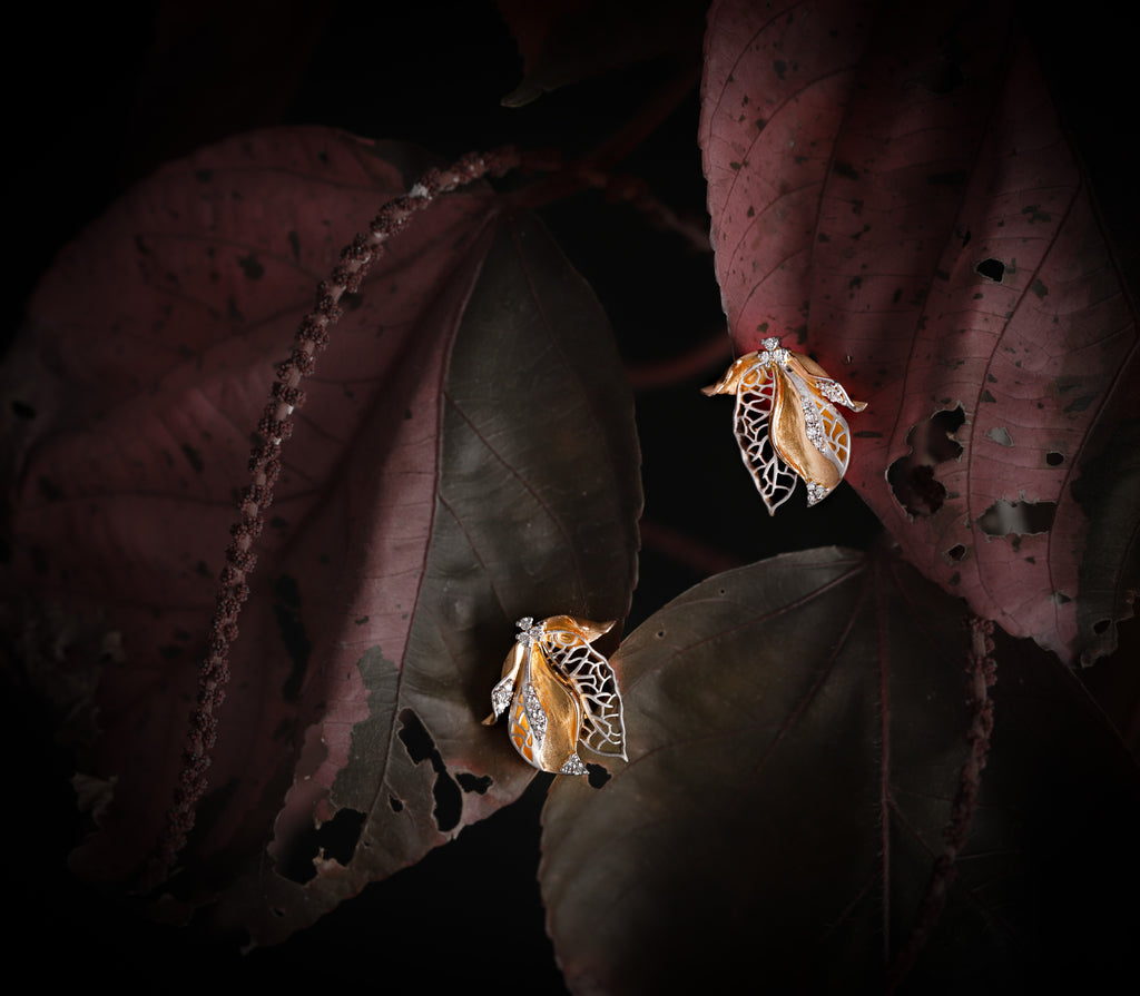The Azalea earrings conclude the story that their namesake pendant relates: as the flower matures and sheds most of its adornment, its splendor is retained in the modesty of three gold petals. The stunning leaf mesh remains its companion, as do the diamond-embellished specks of pollen.