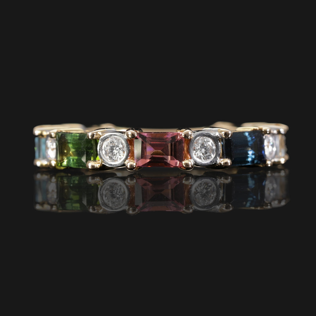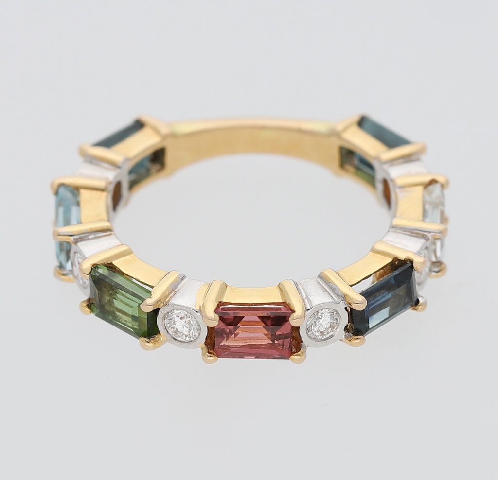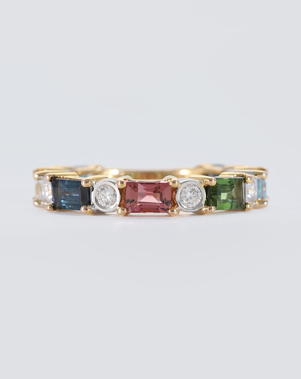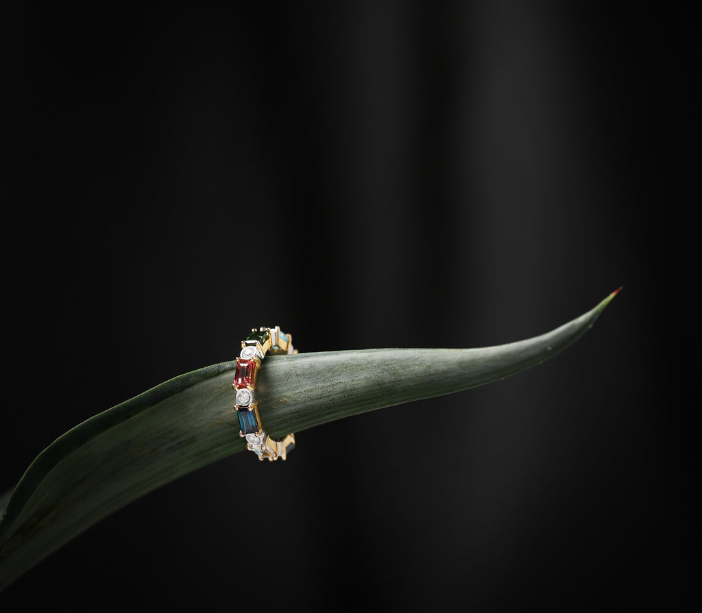 In a contemporary design, the Bahaar ring plays with contrasting shapes - callibrated, faceted baguette stones and bezzle set round Brilliants. The multicoloured Tourmalines, Blue Topaz, and Sapphires have been hand-picked to paint out the distinctive colours of springtime in Karachi. Hues of blue represent clear azure skies, while greens mimick lush grassy lawns. And the pops of pink stand in for sprays of Periwinkle flowers that are spotted embellishing gardens and parks all over Karachi.