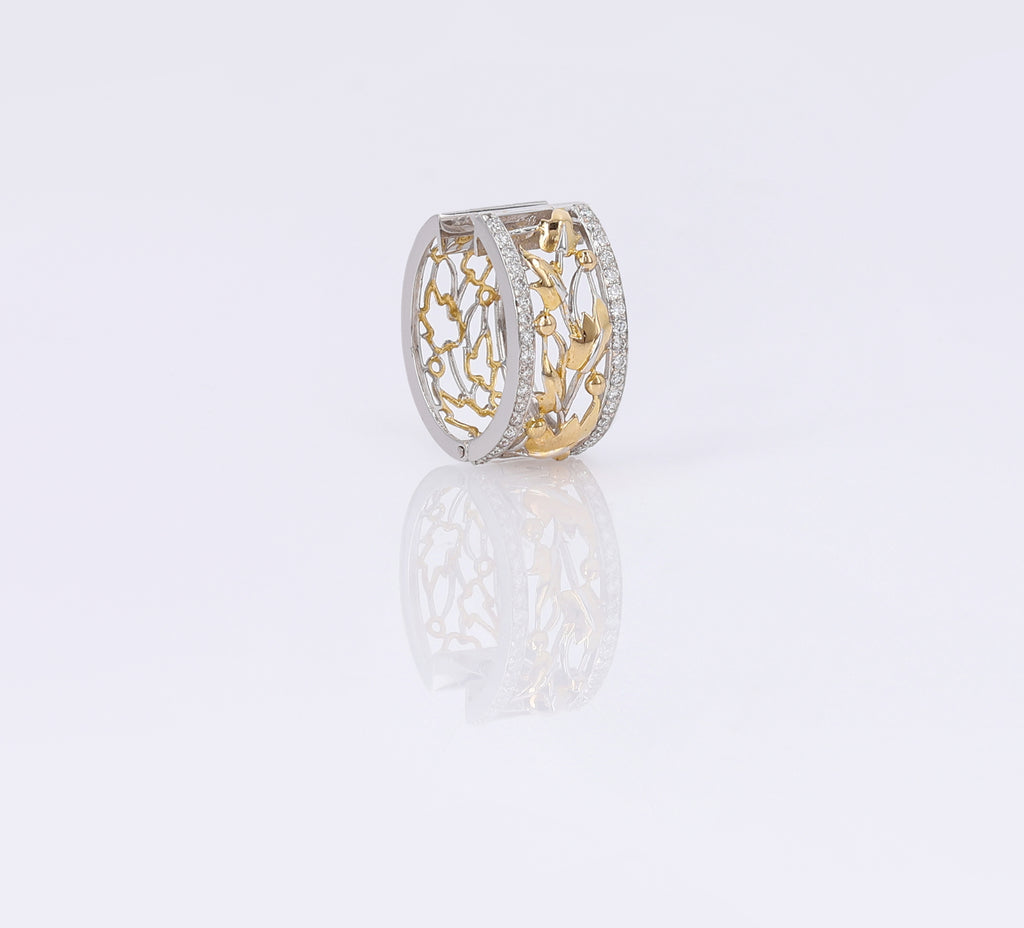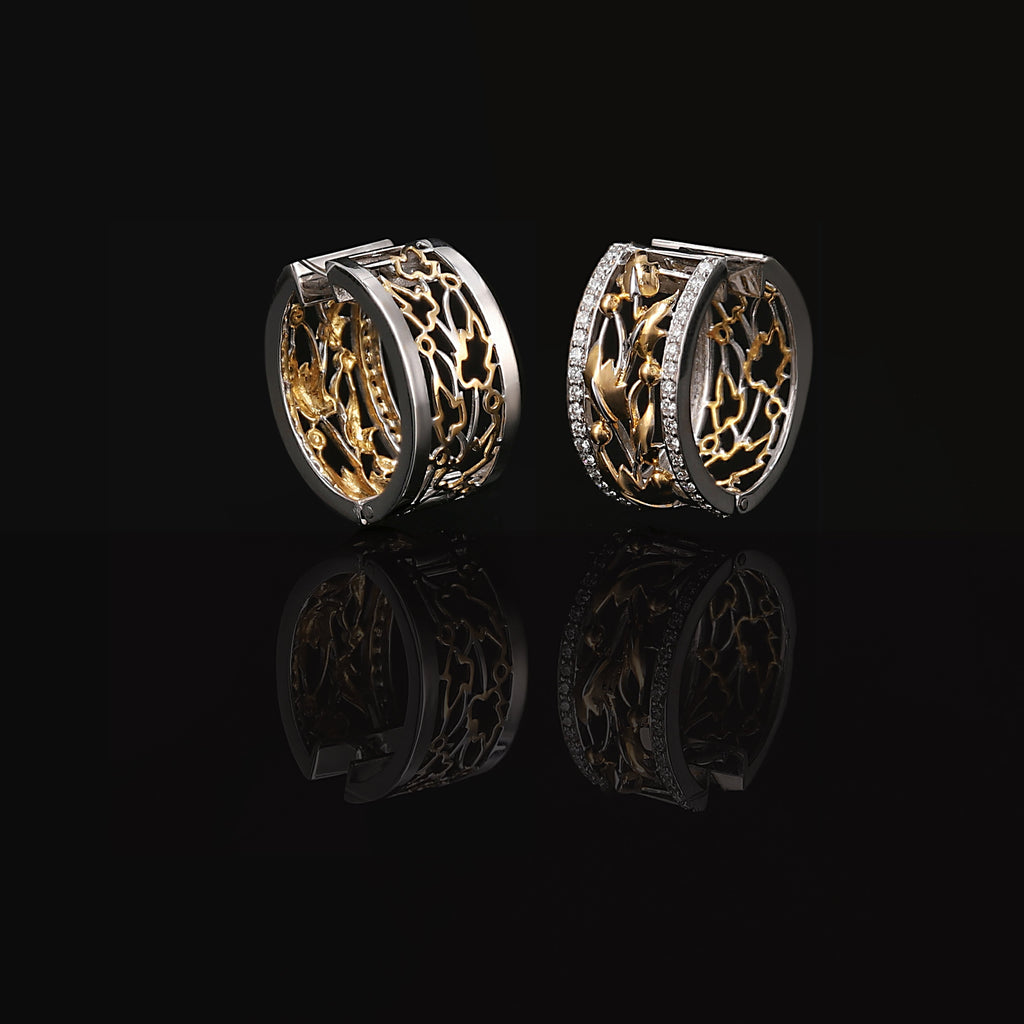The Liana hoop earrings illustrate a web of ascending vines in 20 karat gold, bordered with pathways of brilliant VVS diamonds on either side. As the gold vines evolve into an elegant