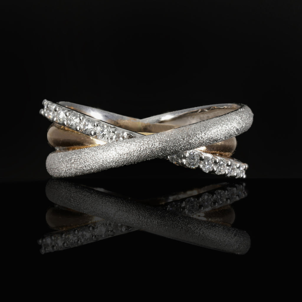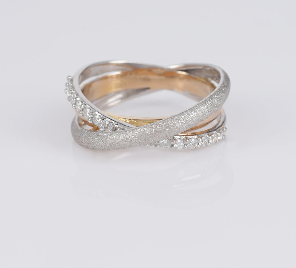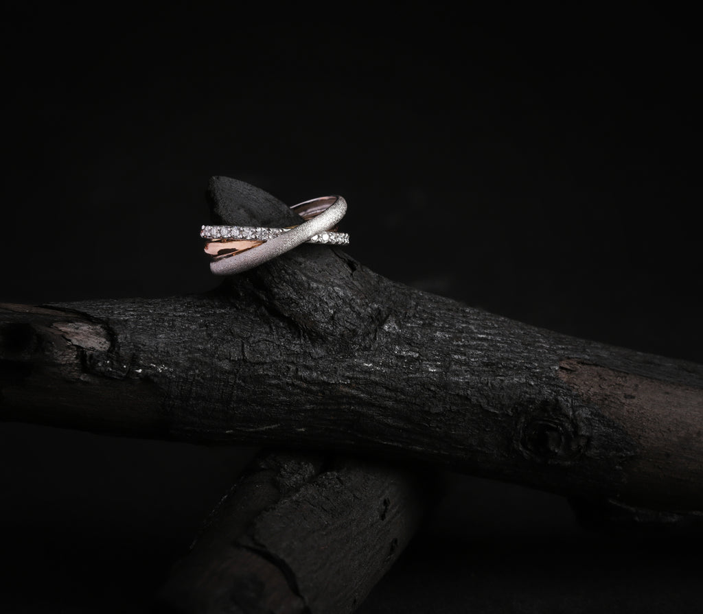 Reminiscent of a cluster of stems that grow intertwined with each other, this elegant design symbolizes maturation. The trinity of stems are manifested in a stunning queue of brilliant diamonds ,soft, shimmering textures, or luxurious polished gold -- three distinct, contrasting elements that work together in coherence, emphasizing that the stems flourish together in spite, or perhaps because, of their individuality.