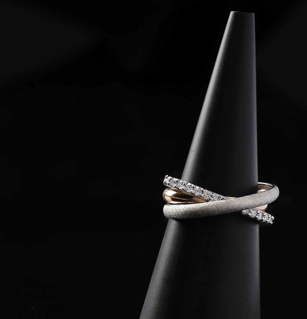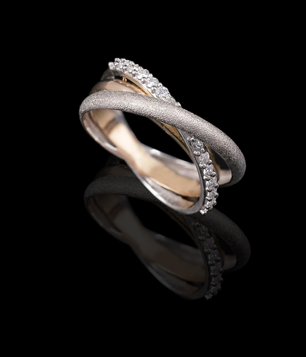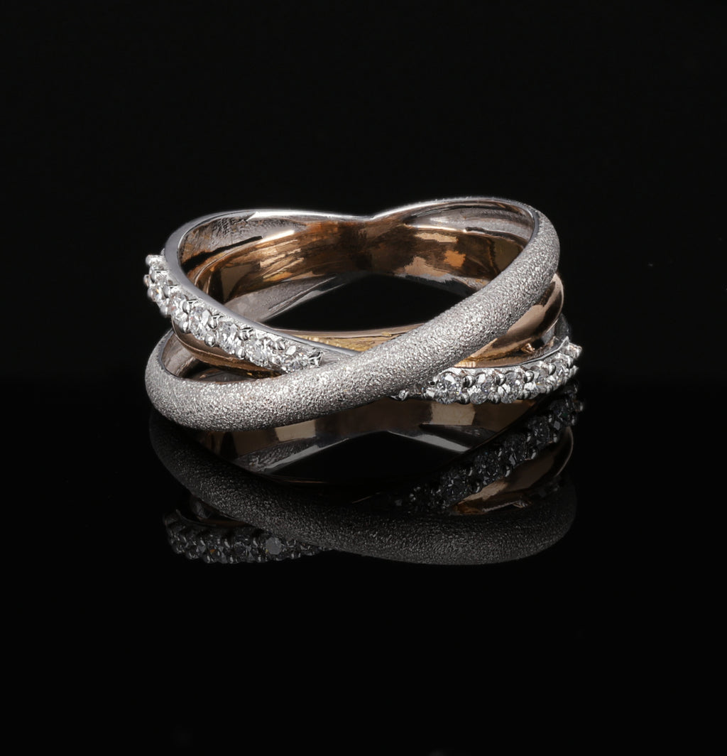 Reminiscent of a cluster of stems that grow intertwined with each other, this elegant design symbolizes maturation. The trinity of stems are manifested in a stunning queue of brilliant diamonds ,soft, shimmering textures, or luxurious polished gold -- three distinct, contrasting elements that work together in coherence, emphasizing that the stems flourish together in spite, or perhaps because, of their individuality.