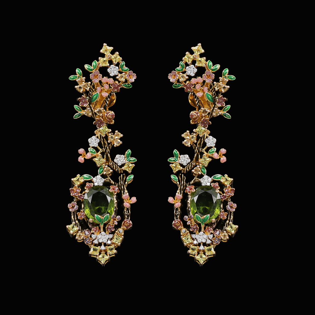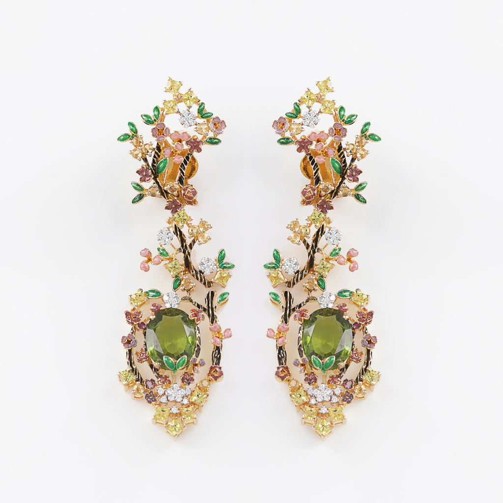 The Bloom Earrings present the portrait of a bough that extends upwards in a metaphor of growth and prosperity. It's branches sprout flowers of Diamonds, Yellow Sapphires and rose-tinted enamel, encasing a luminous, faceted Citrine -- a depiction of a source of warmth and strength.