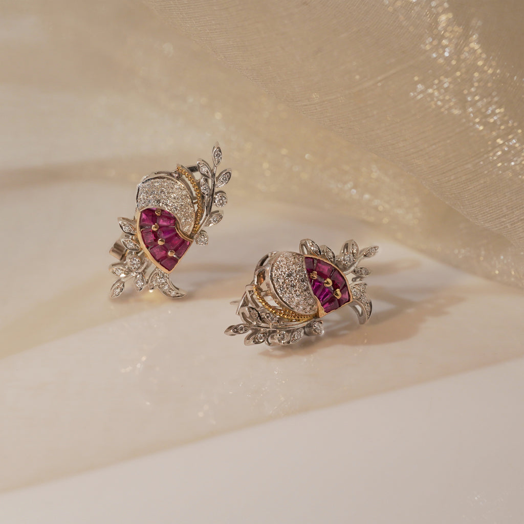 In a stylized depiction of the endearing Myna bird, wings of ruby baguettes are highlighted with diamond encrusted feathers.
