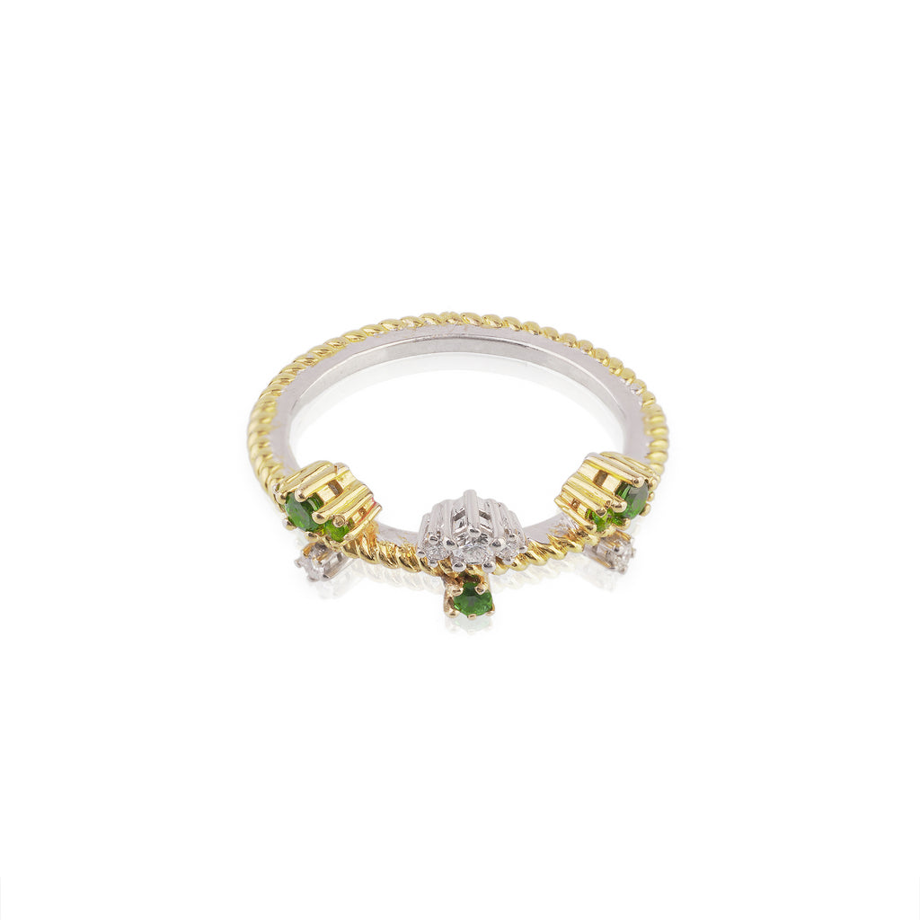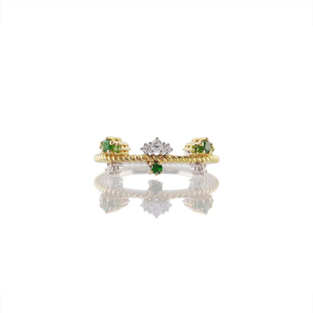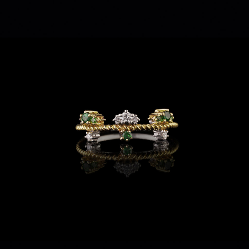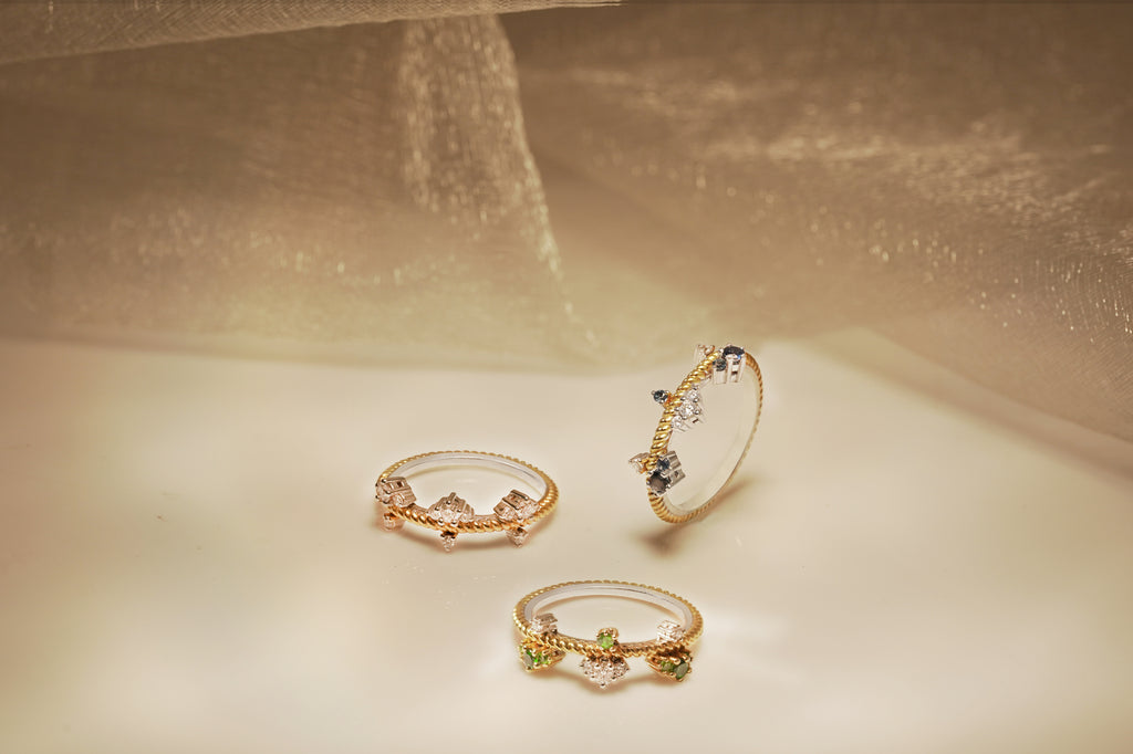 The lithe sequence of diamonds and coloured stones highlights the gold rope that symbolizes the joyful support and coming together of everyone.