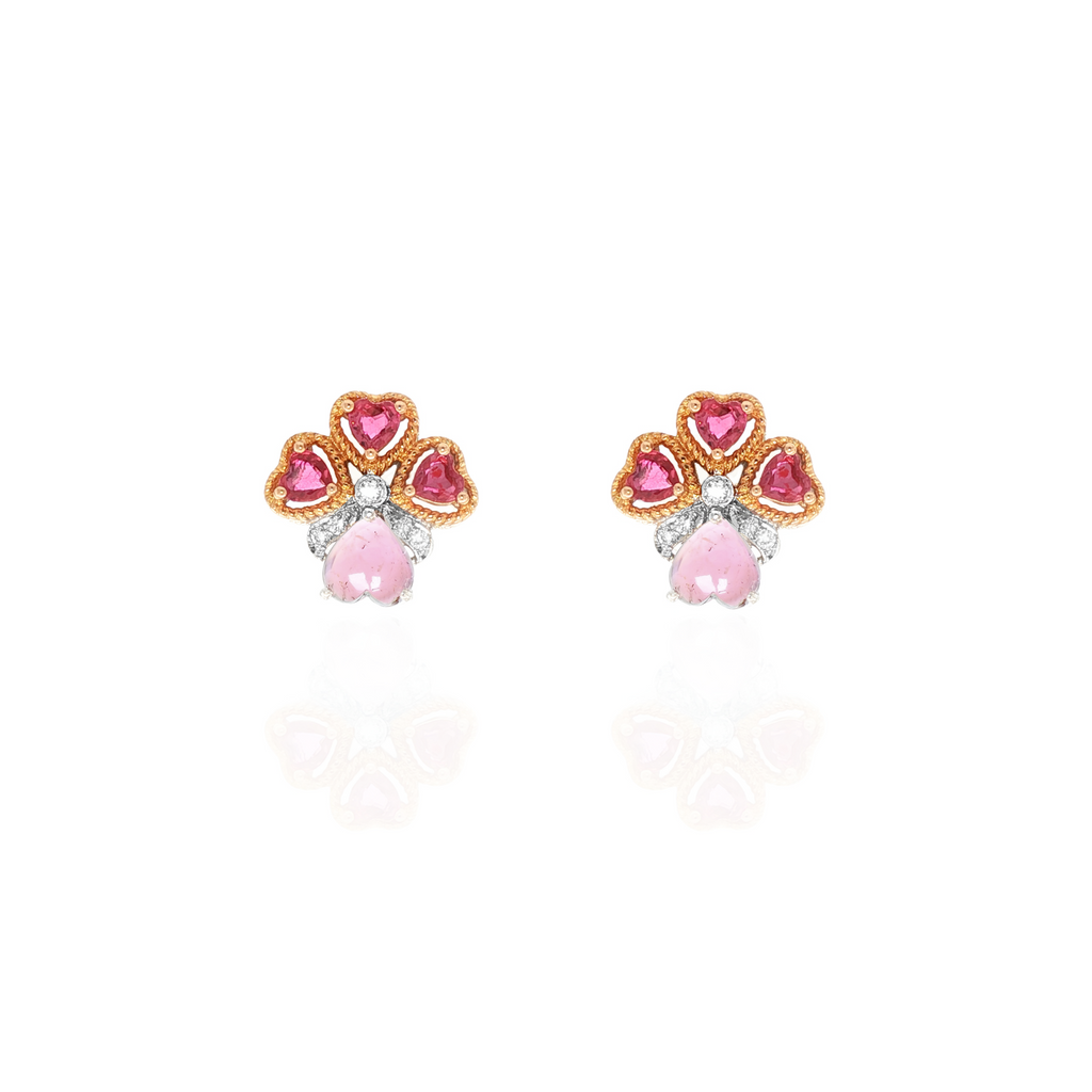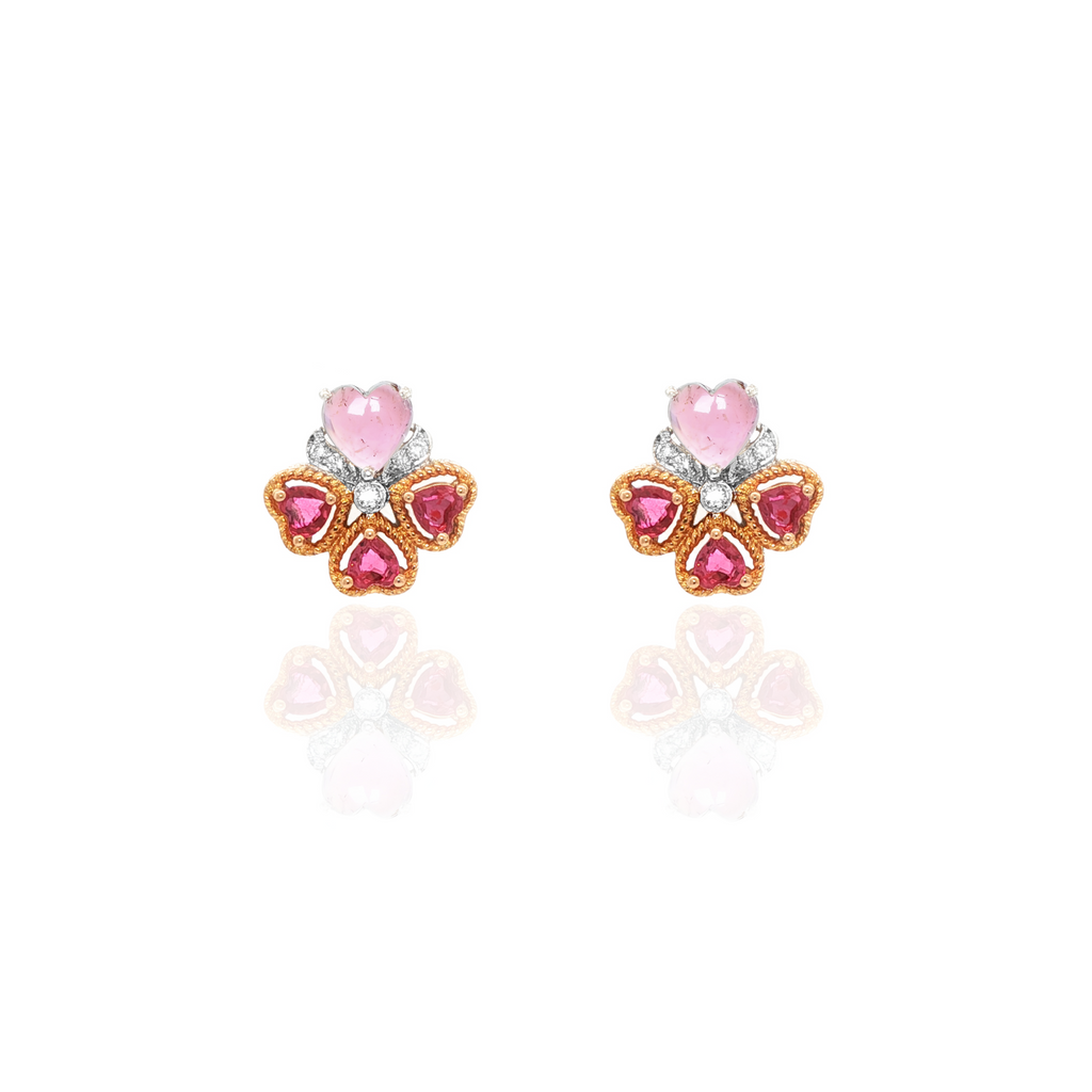 Pink tourmaline cabochon hearts pair with faceted ruby hearts in a playful, feminine design, finished with sparkling diamonds and delicate twisted-gold wire.