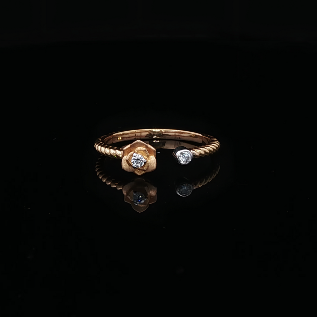 A delicate open-style ring featuring a gold flower paired with a bezel-set diamond along a band of twisted gold wire. Feminine, refined, and subtly charming.