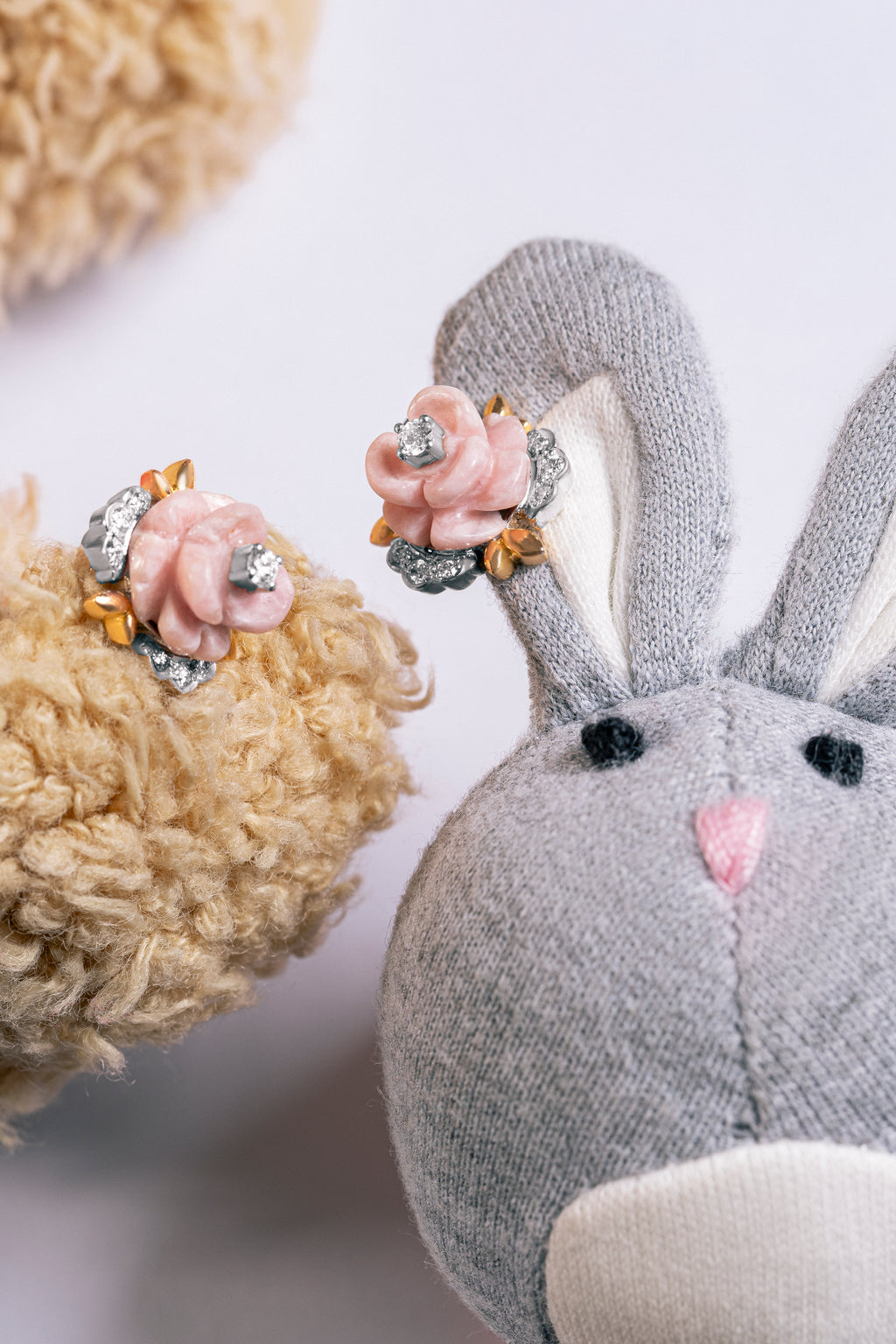 Carved baby-pink rhodochrosite rosebuds bloom beside polished gold petals and sparkling diamonds. Soft, delicate, and feminine — an effortlessly wearable pair that’s sweet, versatile, and suited for all ages.